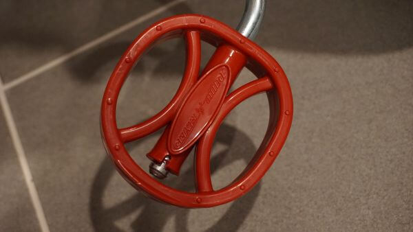 바퀴도 안정감있게 생겼습니다. 충격흡수를 잘하는 스펀지 느낌이 나는 고무 퐄 재질 바퀴입니다. 울퉁불퉁한 곳에서 자전거를 탈 때 몸에 충격이 가는 것을 방지한다고 합니다. 또한 소음이 없어 실내에서도 층간 소음 걱정없이 탈수 있습니다.