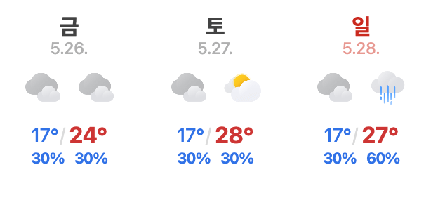 | 시간 | 26일 금요일 | 27일 토요일 | 28일 일요일 |
