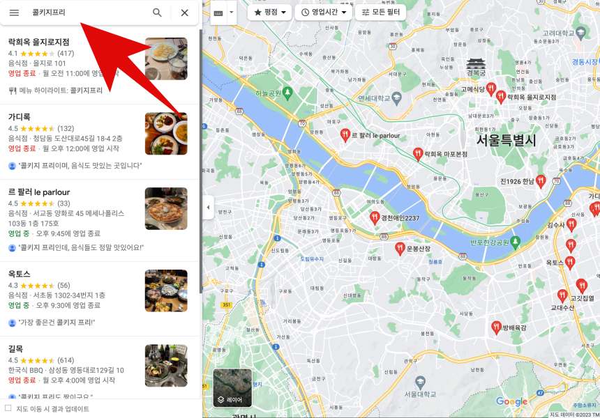 구글맵의 검색창에서 '콜키지프리'를 검색해봅니다. 아직 일반 음식점에서 콜키지프리로 검색되는 곳은 많지 않지만 검색되는 곳이 많이 보입니다. 이렇게 구글맵에서 체크하고 식당에 전화를 걸어 다시 한번 체크하면 콜키지프리를 제대로 이용할 수 있을 것 같습니다.